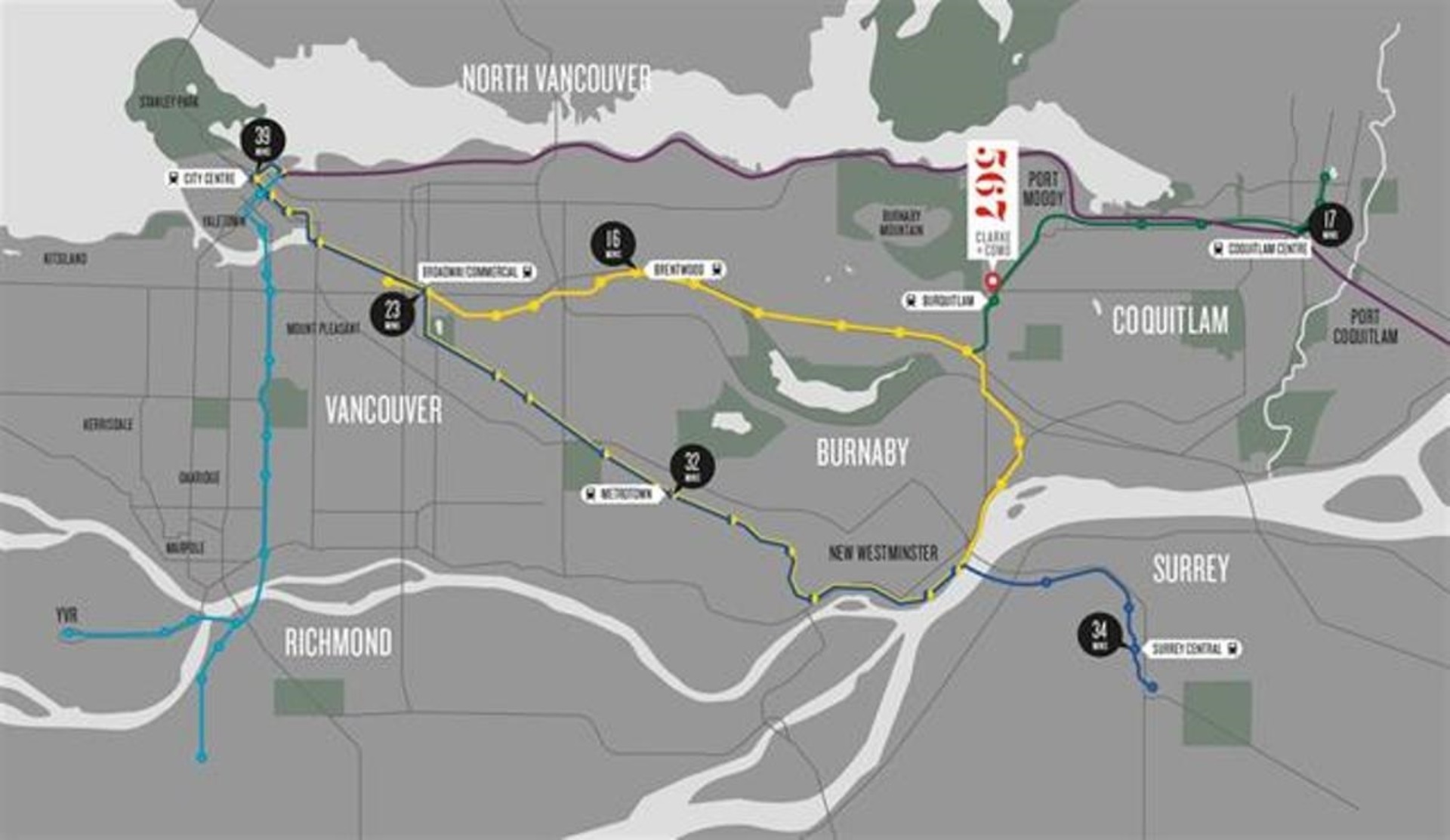 567 Clarke + Como at 5667 Clarke Road, Coquitlam – Inspired by the converging angles of the streets below, the slim, angular tower of 567 Clarke & Como is a sculptural expression in concrete and glass. Rising from the highest point in West Coquitlam, 567 will soar 49-storeys above the streets below – sure to become a landmark as Coquitlam’s tallest tower and defining the skyline of the Lower Mainland’s fastest growing transit-based community. The intersection of life and style has been defined – and it’s 567 by Marcon.